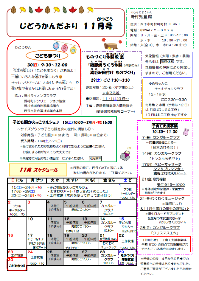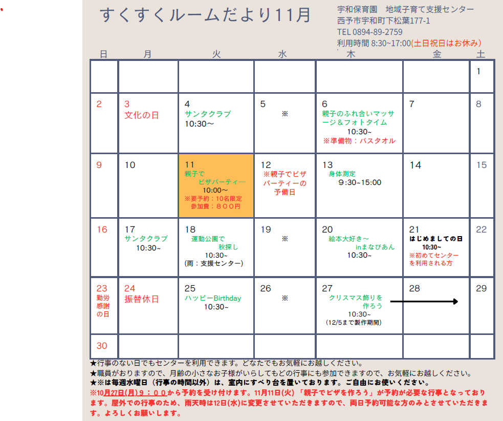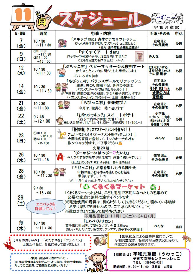 西予市内の子育て支援センター・児童館では、毎月いろいろなイベントを用意していただいておりますので、ぜひご利用ください。