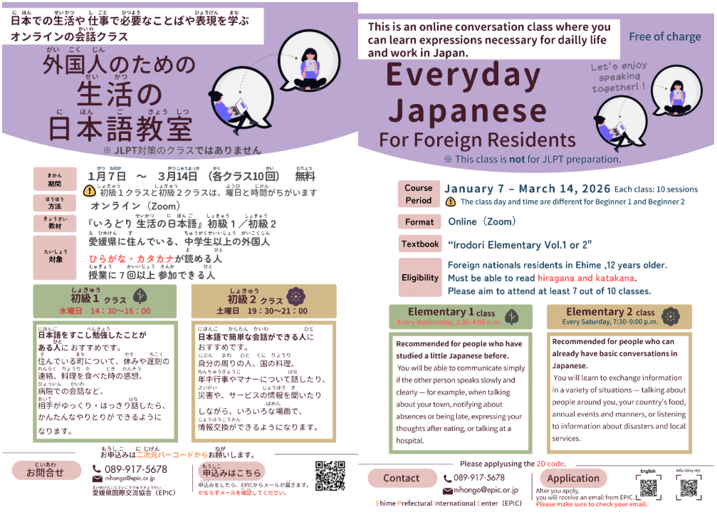 愛媛県国際交流協会(えひめけん こくさい こうりゅう きょうかい)(EPIC)の 日本語教室(にほんご きょうしつ)の おしらせ です。