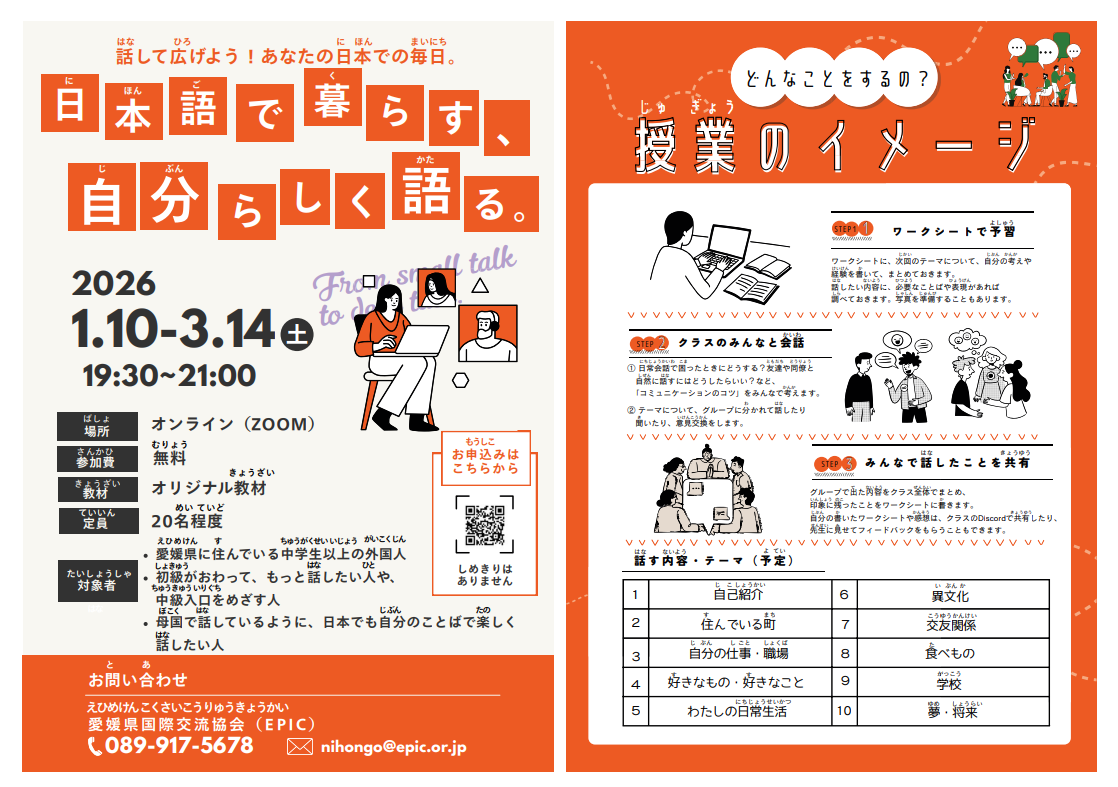 日本語教室(にほんごきょうしつ)が あります(愛媛県国際交流協会からの おしらせ)