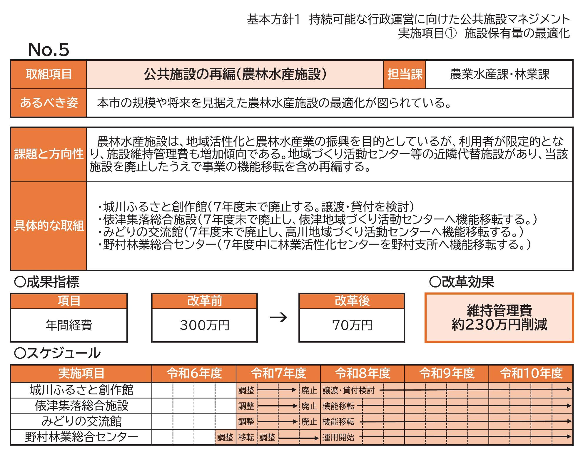しかしながら、同一敷地内にある各施設の用途が類似していることや、人口減少の進行もあって、近年では大きく利用人数が減少している状況であるため、財政危機脱却プラン2025(下記NO.5抜粋)に基づき、施設の運用方法の見直しの検討を地元とともに行った結果、当該施設を廃止し、地元組織において有効活用を図ることが適切であるとの判断から、令和8年3月議会において本条例の一部改正を行いましたので報告いたします。