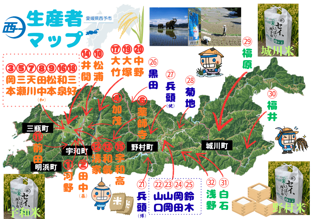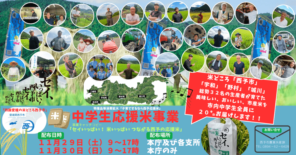 - 本事業のキャッチコピーは、「セイいっぱい、米いっぱい、つながる西予の応援米」です。