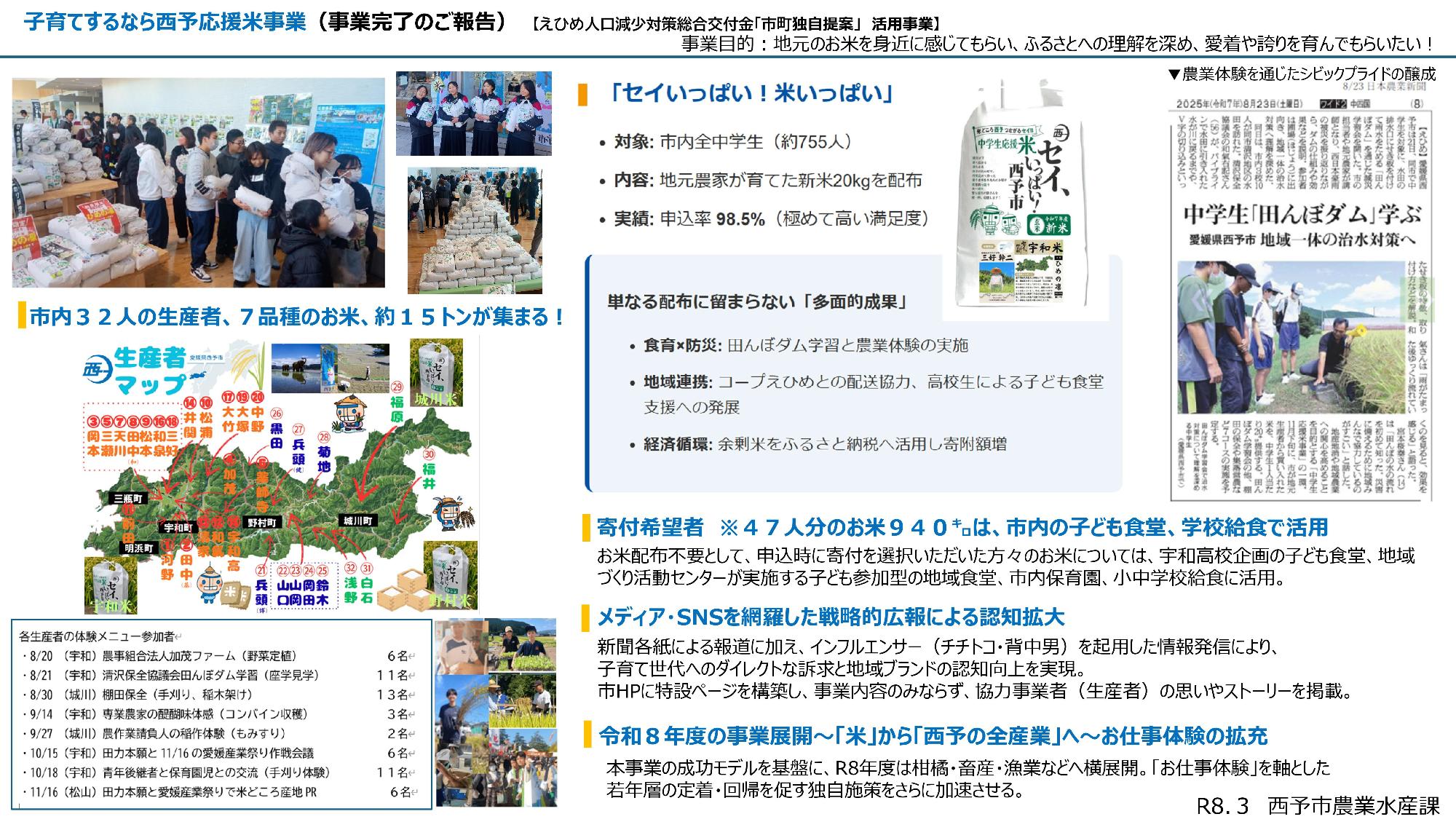 - 西予市では、愛媛県内有数の米どころの産地PRに加え、中学生への郷土愛の醸成と子育て世帯の生活を支援するため、市内の米農家と連携して、地元産米を食べ盛りの中学生に対して配付する「特産品等消費拡大事業」を実施します。